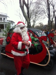 The parade was lead by a group of young girls dancing to “Jingle Bell Rock” and closed by, of course, Santa. Actually, there were two Santas – one on the fire truck, one in a Smart Car that had been tripped out with bright red “sleigh” sides. Not sure which Santa was the helper, but they both were great.